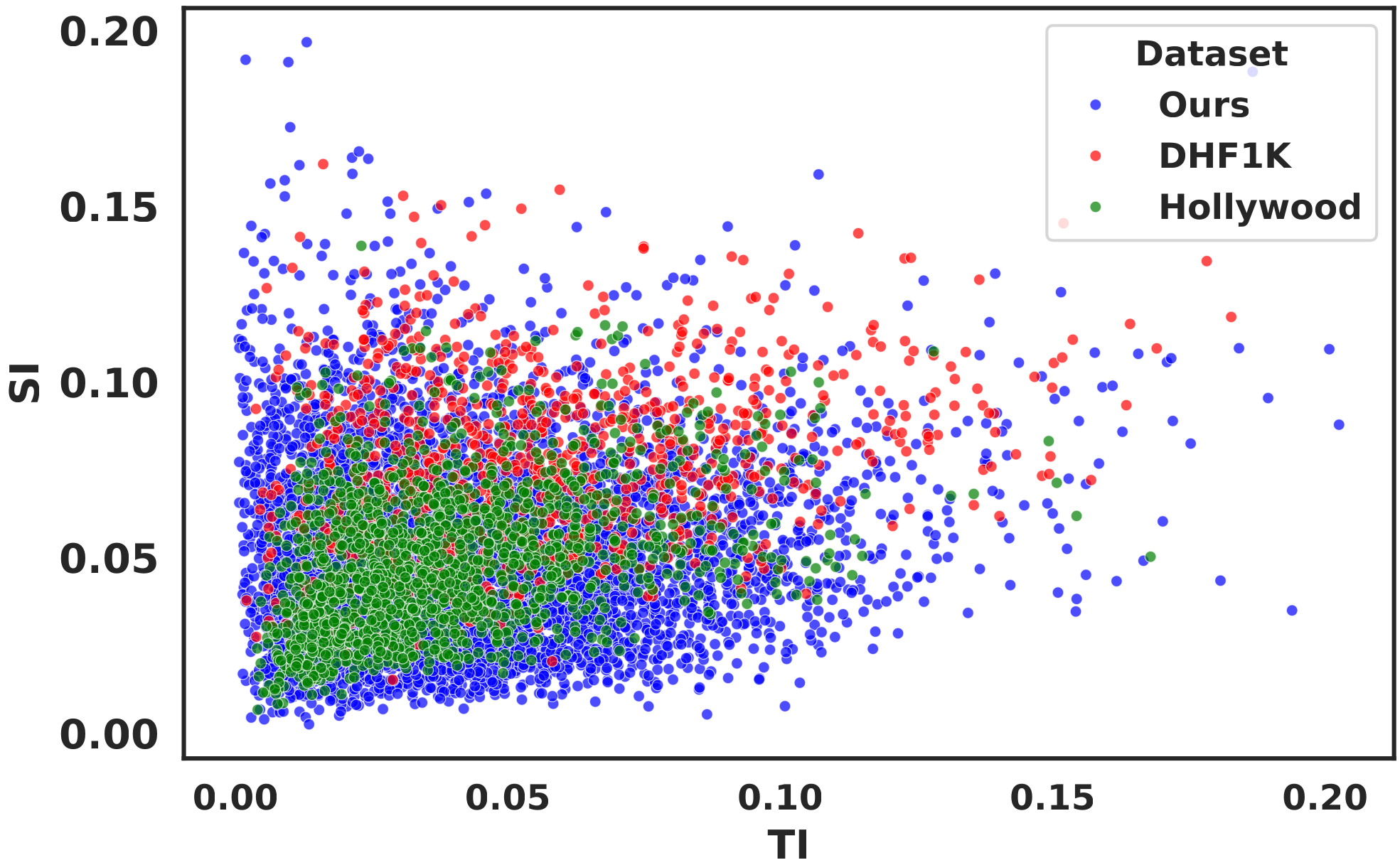 As shown in the figure, our CrowdSAL dataset has a more diverse distribution of motion and spatial information parameters than DHF1K and Hollywood-2, which contain 1,000 and 1,707 videos, respectively. For this comparison, we used SI/TI metrics to characterize the spatial and temporal complexity of the datasets.